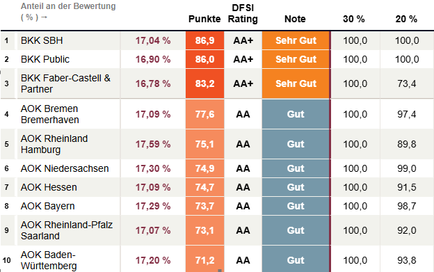 Die DFSI Deutsches Finanz-Service Institut GmbH hat auch in diesem Jahr wieder für das Handelsblatt die Finanzkraft der Krankenkassen untersucht. Dabei wurden sieben Aspekte bewertet, die in unterschiedlicher Gewichtung in die Gesamtnote eingingen. Die Kriterien waren: